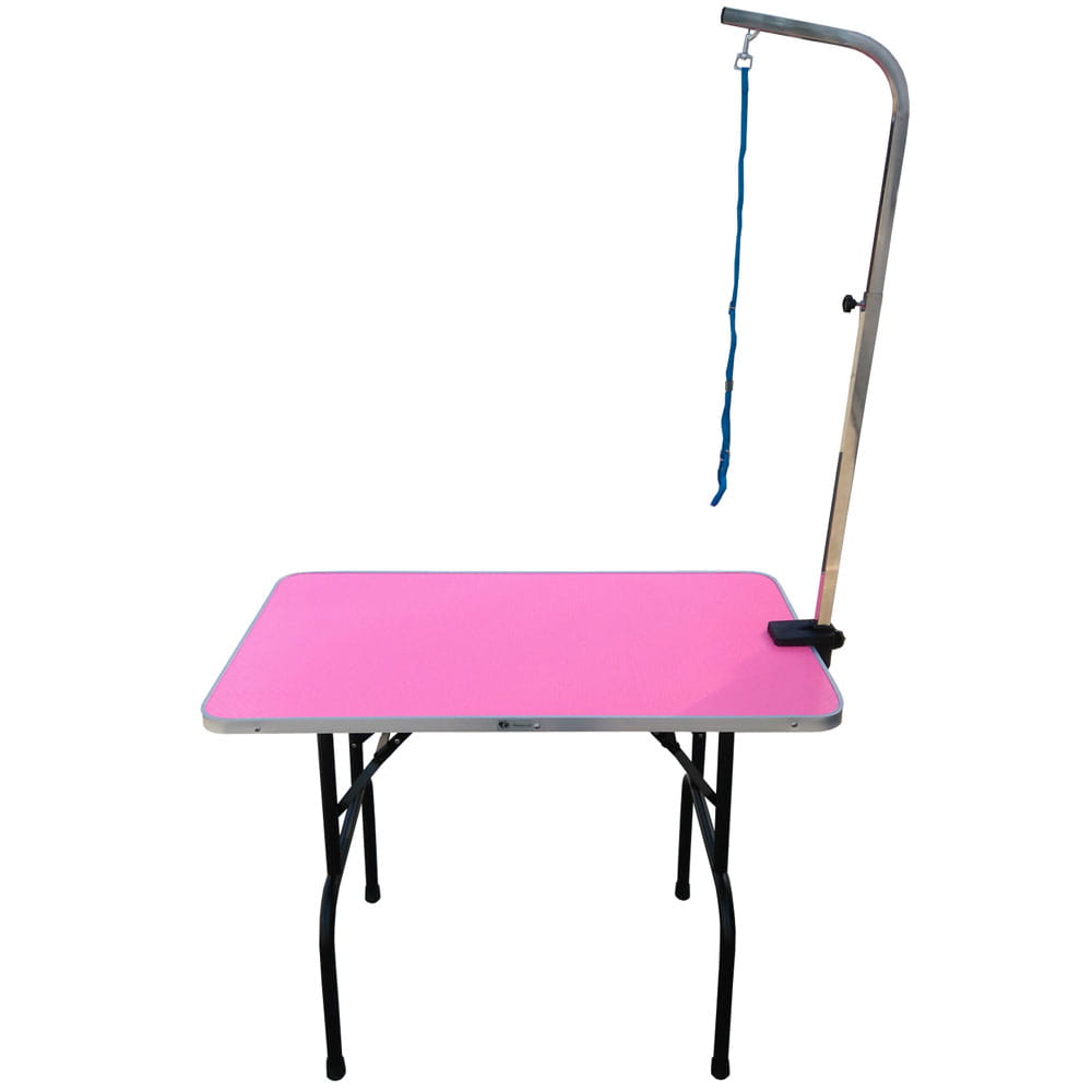 Stół do pielęgnacji zwierząt z blatem o wymiarach 95 cm x 55 cm. Wysokość po rozłożeniu 76 cm. Blat pokryty antypoślizgową matą. W komplecie z wysięgnikiem jednostronnym i smyczą. Kolor blatu: różowy.